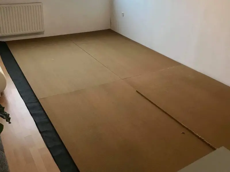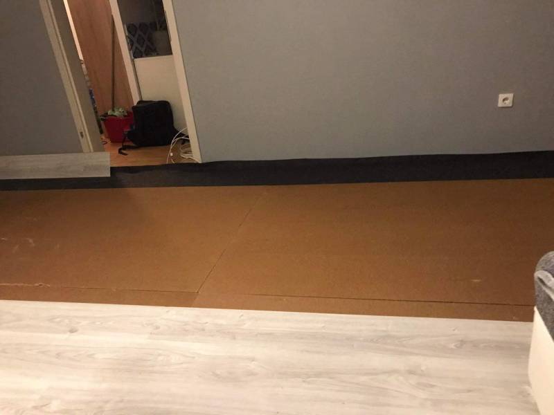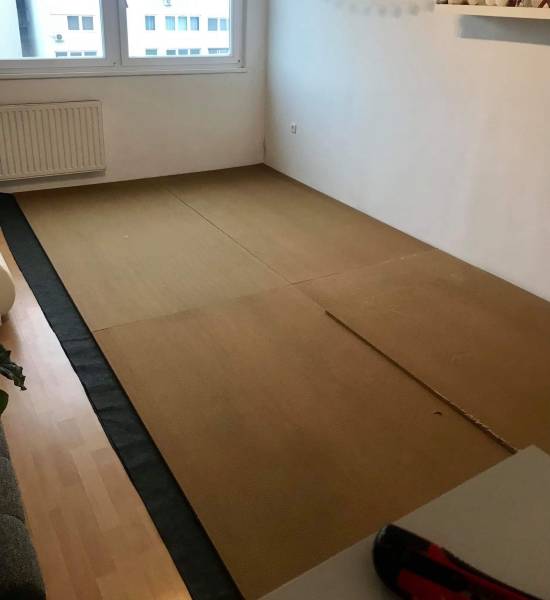 Ezért első körben csak a padló: Nappali- Hálószoba/ Gardrob padlójára tettünk javaslatot. Figyelembe véve a körülményeket, jobbnak láttuk lent hagyni a meglévő padlószőnyegre lerakott laminált padlót, nem fokozva a problémát szemét és por, valamint annak logisztikája feladatával. Vagyis az új hangszigetelő réteg a padlószőnyeg + laminált padló tetejére került. Különösebb szakértelmet nem igénylő, egyszerű beépítése a rétegeknek, egyszerű házi sniccerrel jól vághatóHALLTEX Alátétpaneljeink méretükből adódólag gyorsan lerakhatóak voltak a speciális tekercses szigetelővel együtt. Szerencsére a munkahelyen kialakult kiváló segítő jóvoltából a laminált padló és lábazata visszarakása után végre csend volt a lakásban.