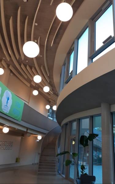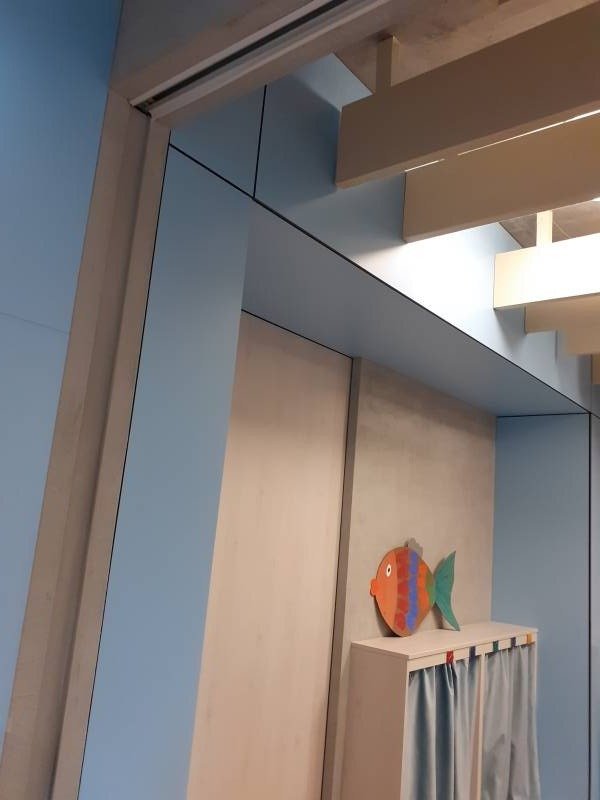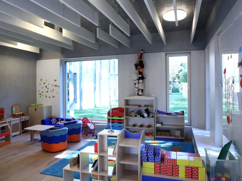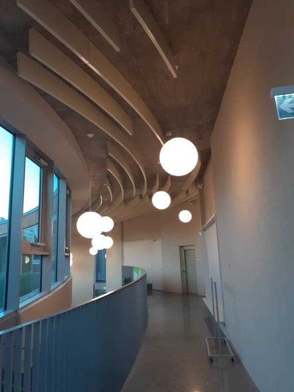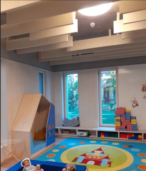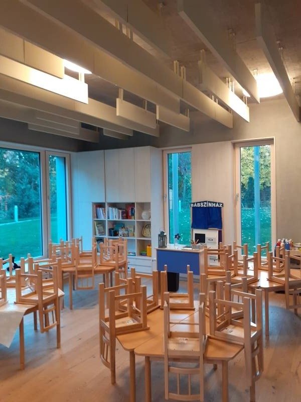 A legújabb építészeti előírások szerint óvodák/ iskolák esetében a belső térben csak olyan anyagok alkalmazása engedélyezett, melyek megfelelő tűzállósági és egészségügyi minősítésűek. Az M. Fiber Flat panelek megfeleltek ezeknek az igényeknek, kiváló hangelnyelő tulajdonságukat a baffle beépítés csak fokozta.