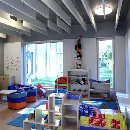 Református Óvodai zajcsillapítás készült egyedi PET-palackokból készült hangelnyelő megoldással. Csoportszobák és nagy belmagasságú folyosórész különleges építészeti megoldásokkal