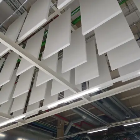 Baffle hangelnyelő rendszer készítése egyedi kivitelezésben PET-palackból, csarnokon belüli zajcsillapítási feladatra