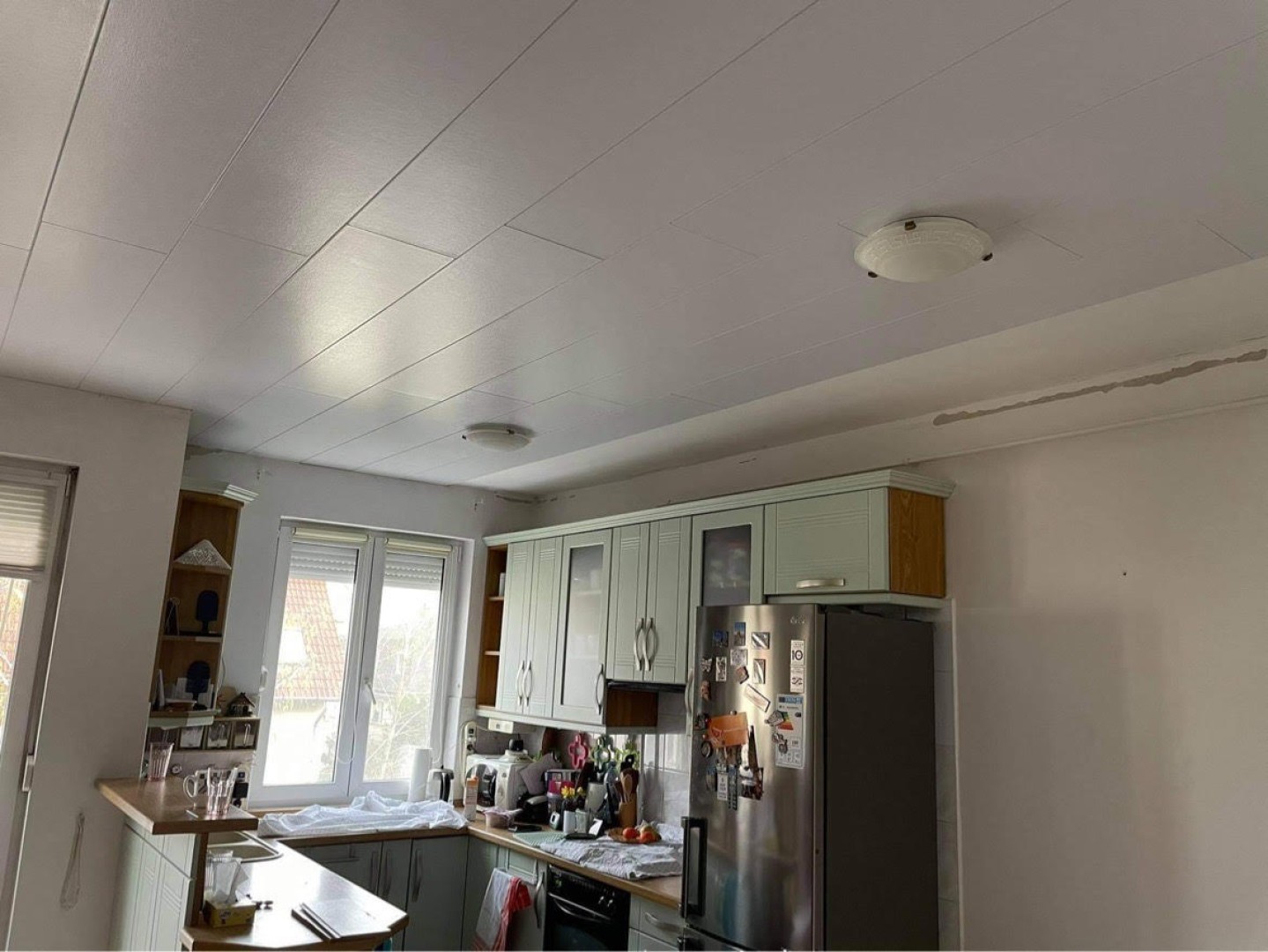 csPapír-tapétás, alatta hőtükörrel ellátott, 4 oldalt fózolt mennyezeti burkolat, kiváló hő- és hangszigetelő tulajdonsággal, 4 oldalt nútféderes illesztéssel.