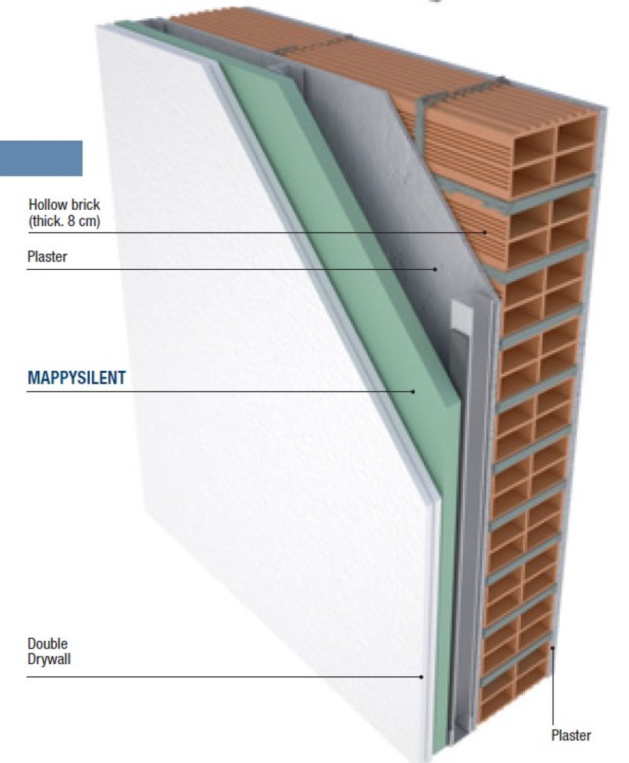 Alkalmazás: MAPPYSILENT akusztikus akadály, amely alkalmas minden olyan esetben, amikor hangszigetelő tömegre van szükség. Épületek, fémszerkezetek, lemezek, üvegszálas és műanyag rétegek rezgései csillapítására. Az építőiparban az M. SILENT ideális minden olyan esetben, amikor szükség van hangszigetelő akadályra a szomszédos környezetek között. Könnyen csatlakoztatható a száraztechnológiai lapok közé (gipszkarton, stb.), az akusztikai teljesítmény növelésére mind falon-, mind mennyezeten használható. M.SILENT akusztikus akadály, amely alkalmas minden olyan esetben, amikor hangszigetelés szükséges: mind a szerkezet alá, mind felújításkor a szerkezet fölé.